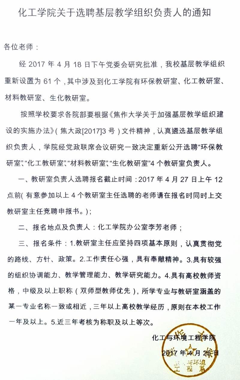 太阳成集团tyc33455cc教研室负责人选聘人选公示