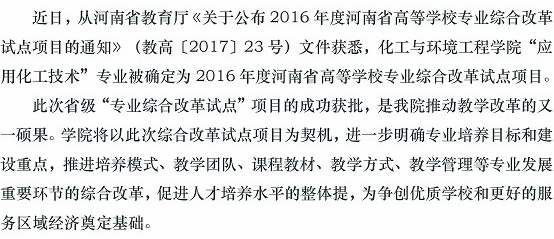 太阳成集团tyc33455cc应用化工技术专业获批2016年度河南省高等公司“专业综合改革试点”项目